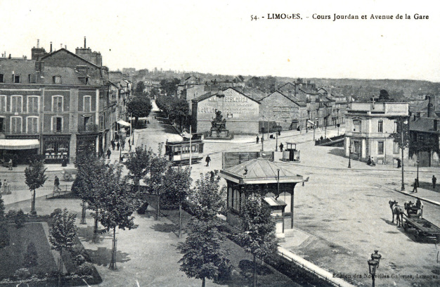 Limoges, partie est de la place Jourdan, avant 1925 ; à droite, le petit immeuble du studio Pineau. Carte postale, Éditions des Nouvelles Galeries.